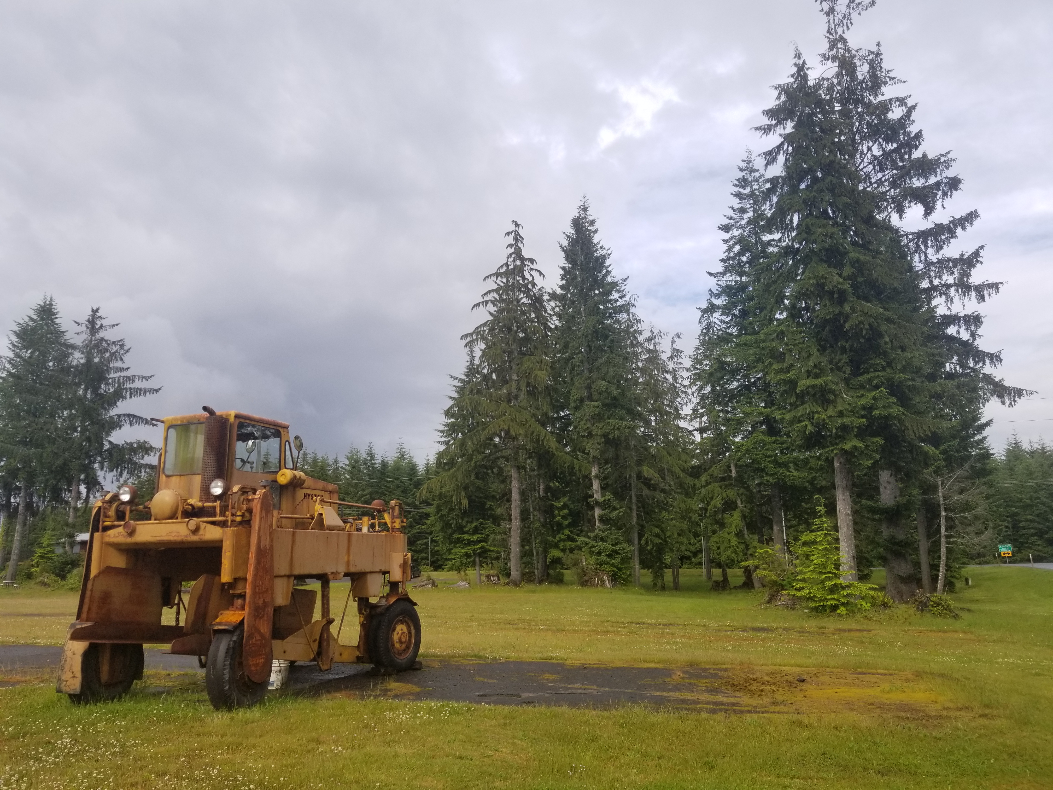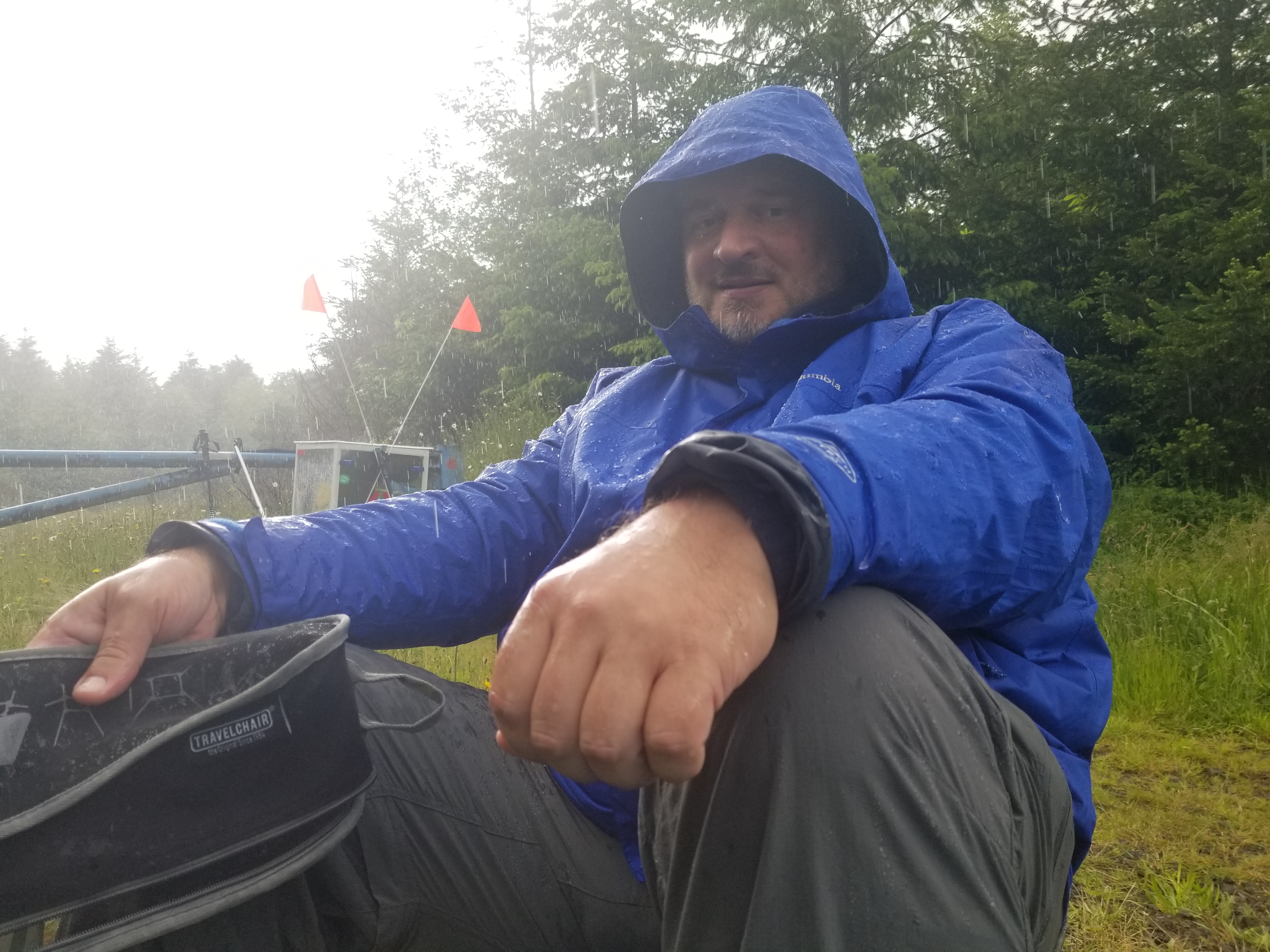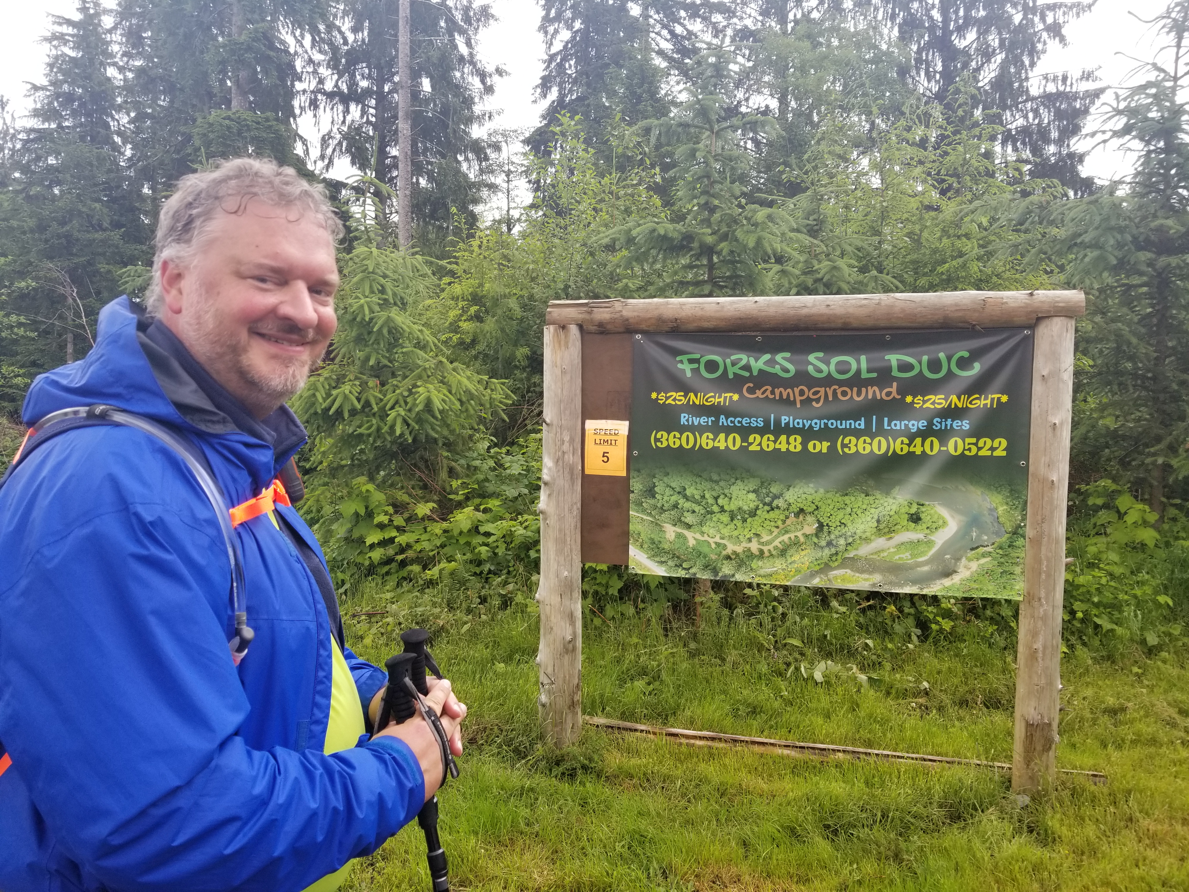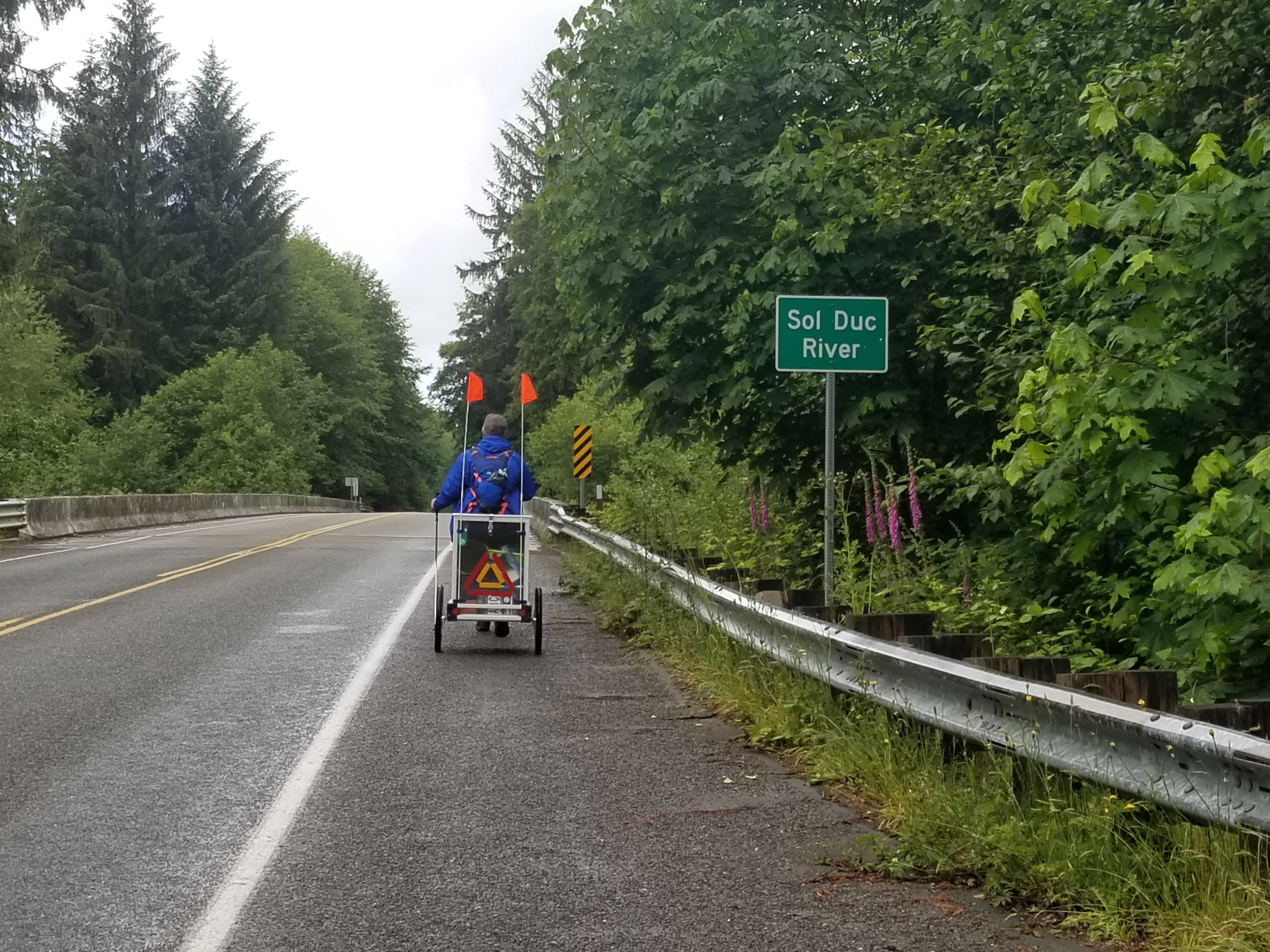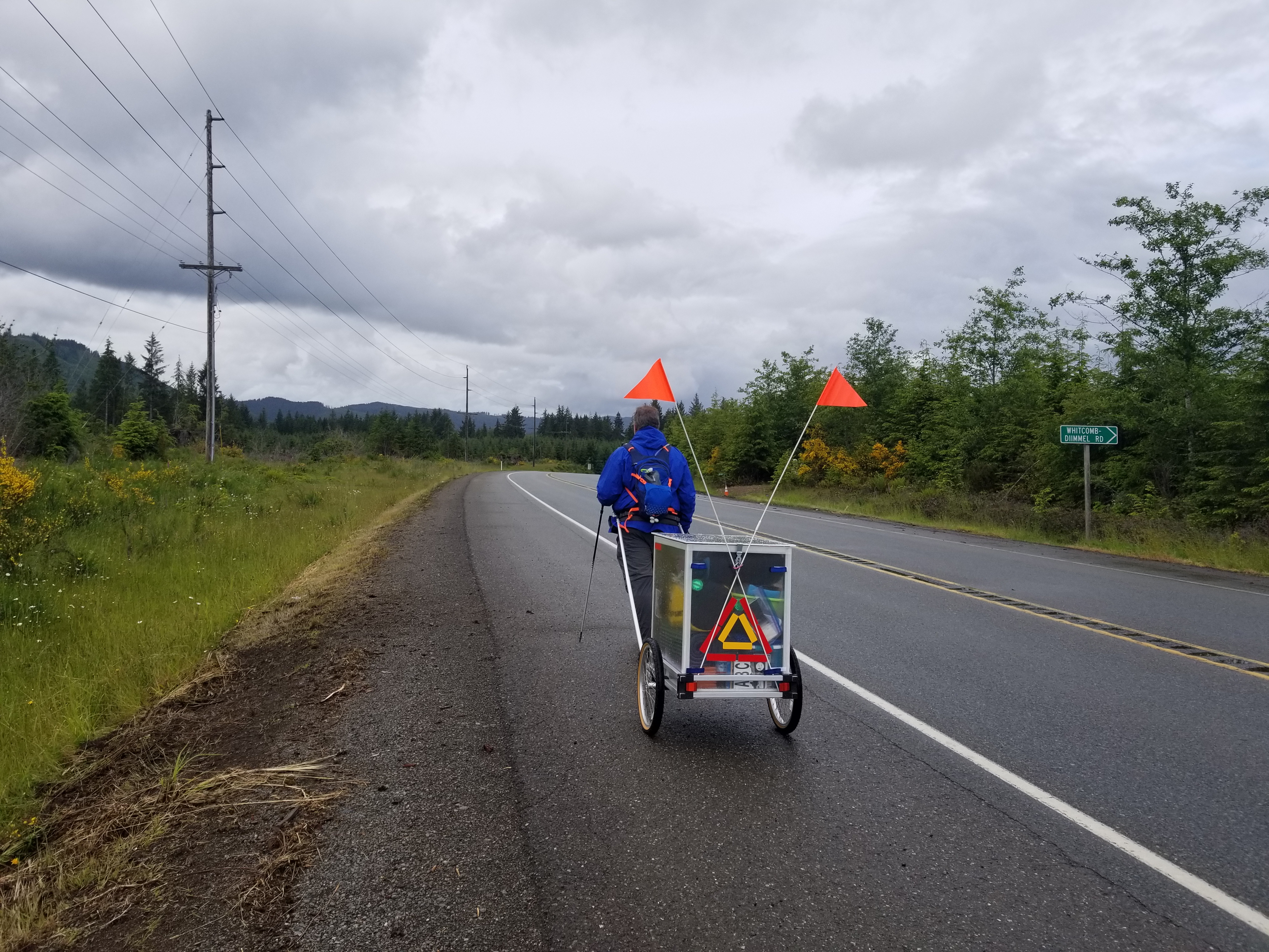 The campground owners’ kids signed our cart and waved us off. Within 100 yards our safety flags failed (apparently velcro doesn’t work in the rain?!), and we had to reengineer them. Then some trouble with our hip attachment points that had to be overcome. Two miles on, as we neared our furthest west point, we finally fell into a rhythm.
