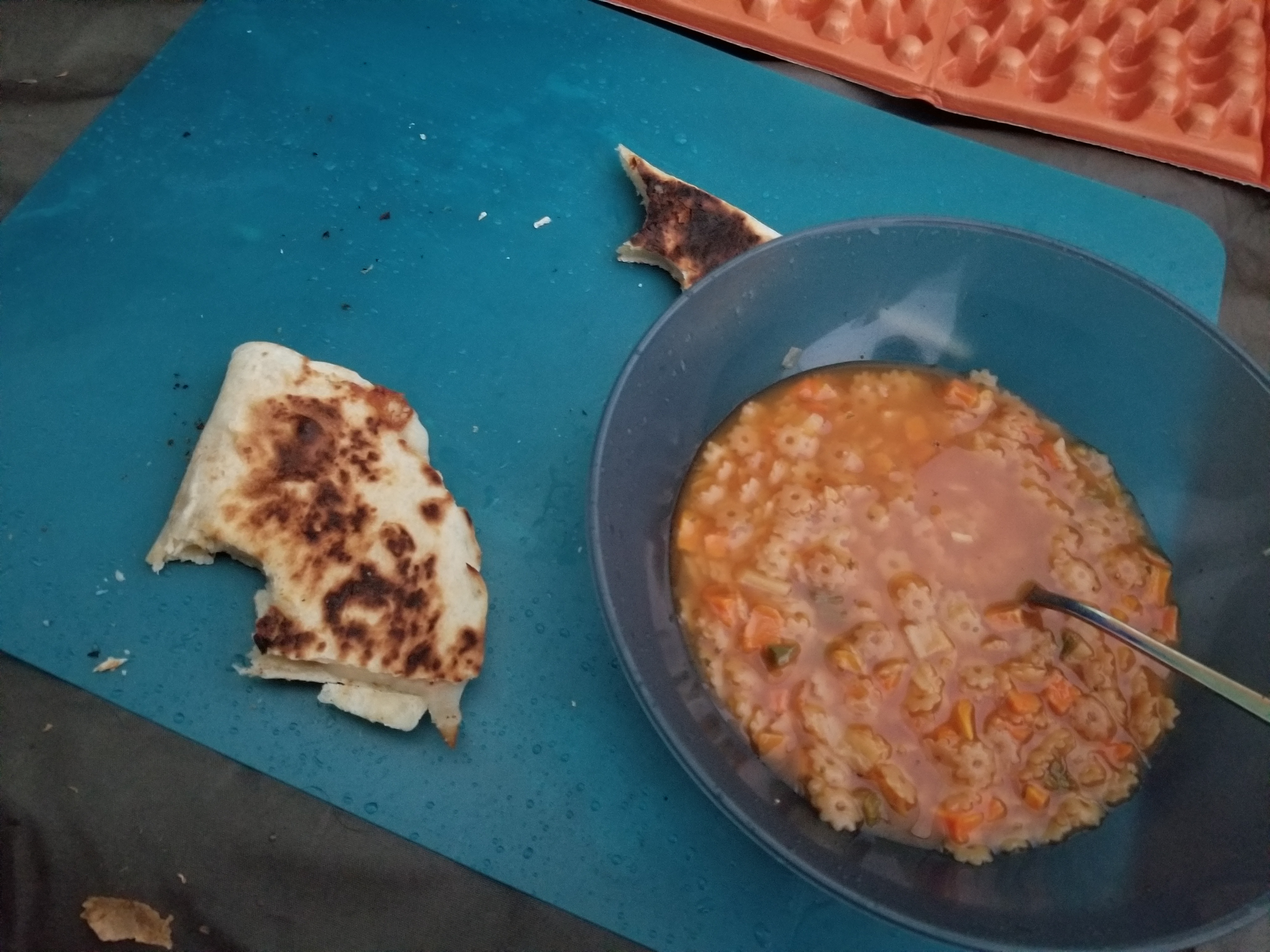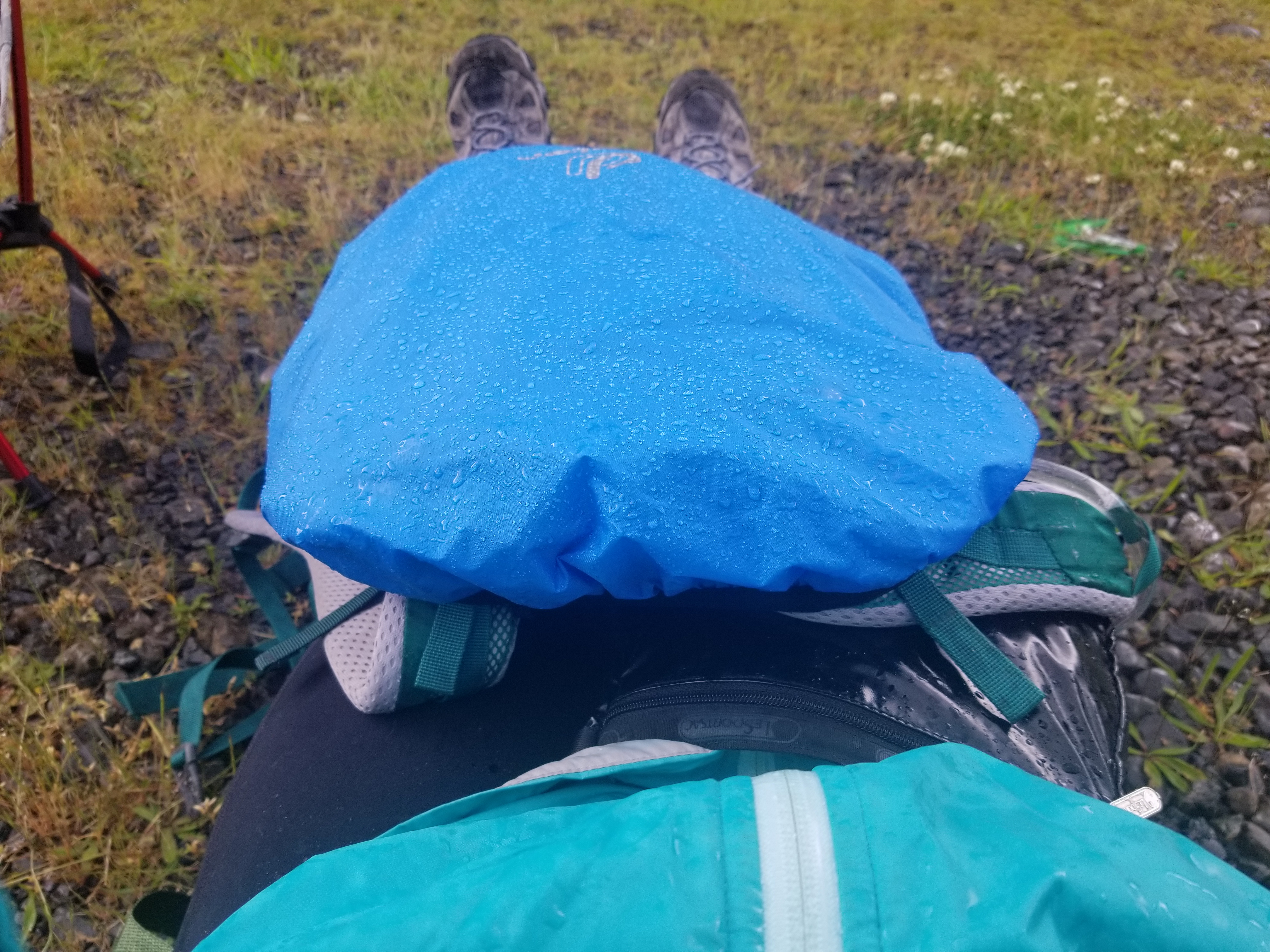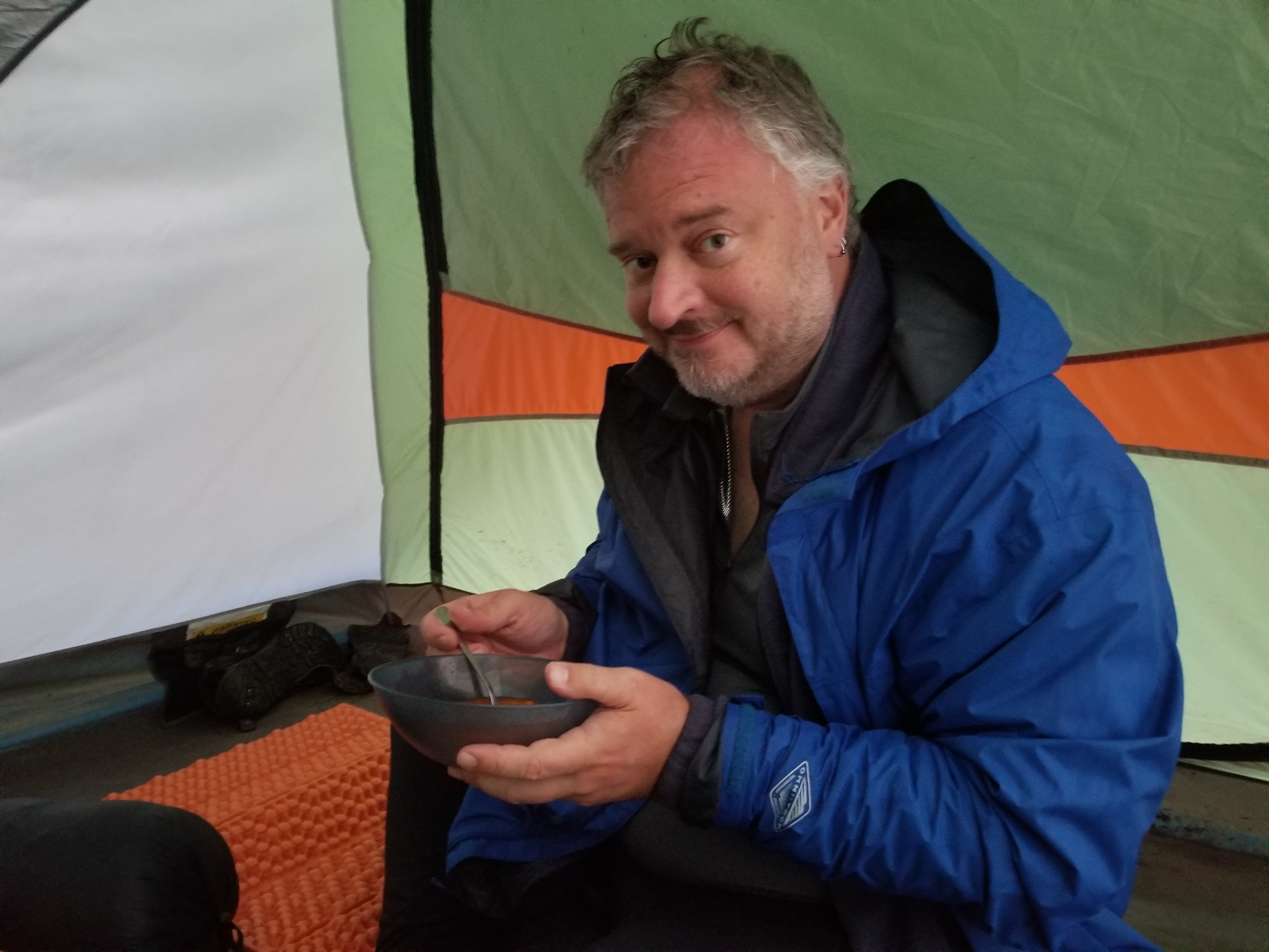 Spoiler alert: we did not wake to clear skies. We woke to a downpour and a puddle under our tent that was soaking through the floor despite a “waterproof” footprint. I dashed out to make breakfast and rescue some gear, and we hunkered down on rubber mats in our tent with oatmeal and coffee to wait it out. By the time it cleared up, and we’d dried our gear enough to pack it, it was noon.