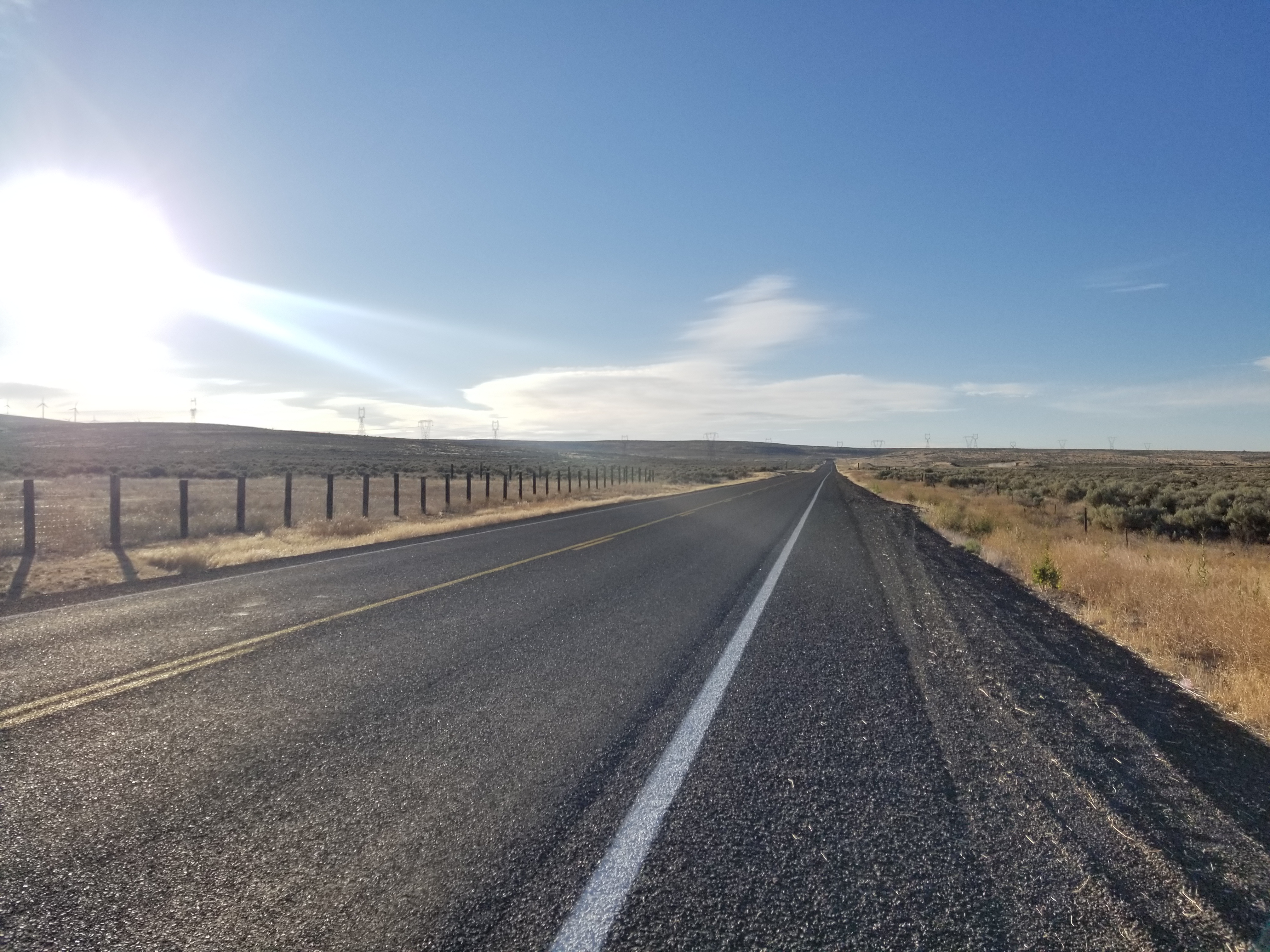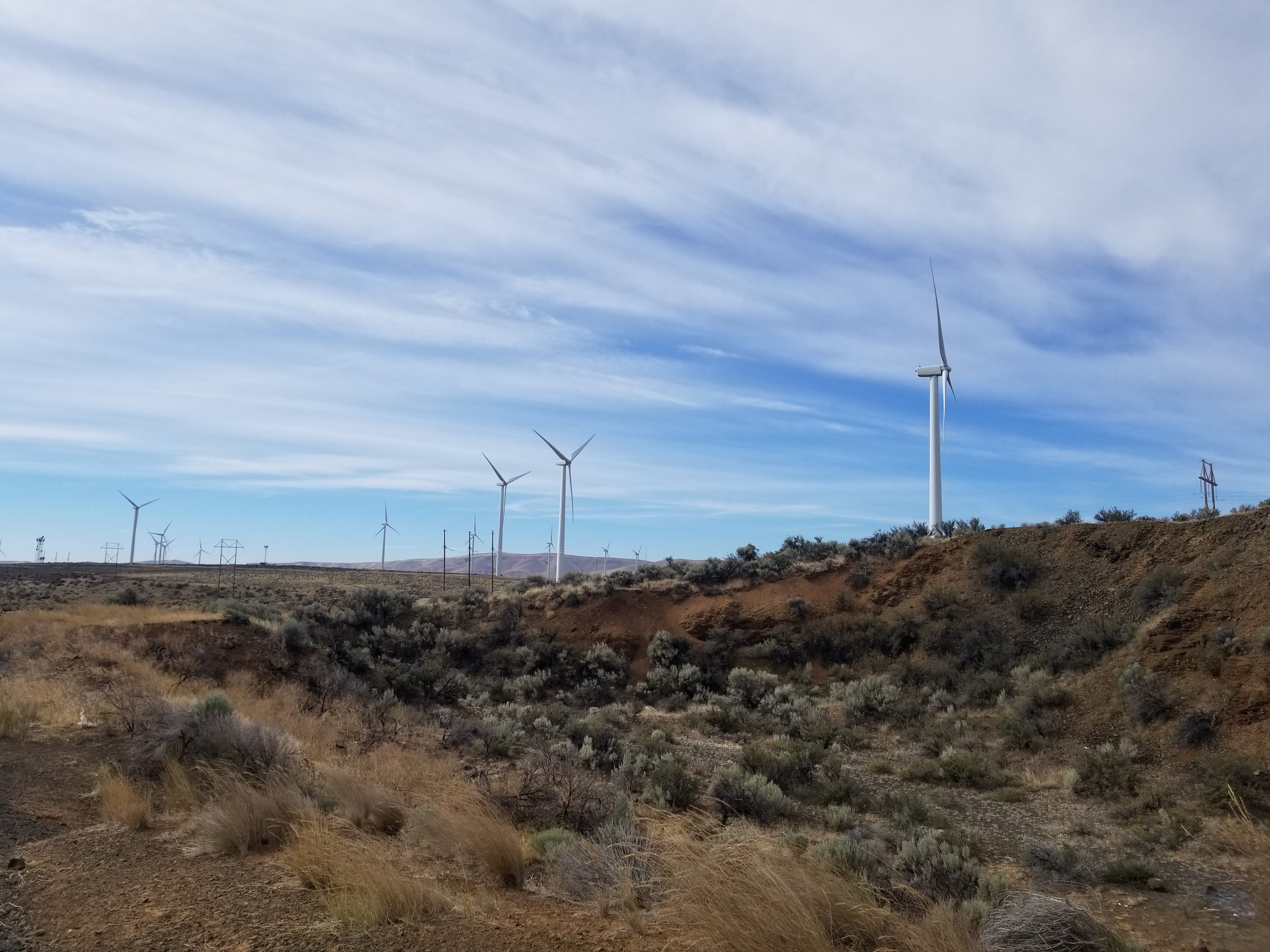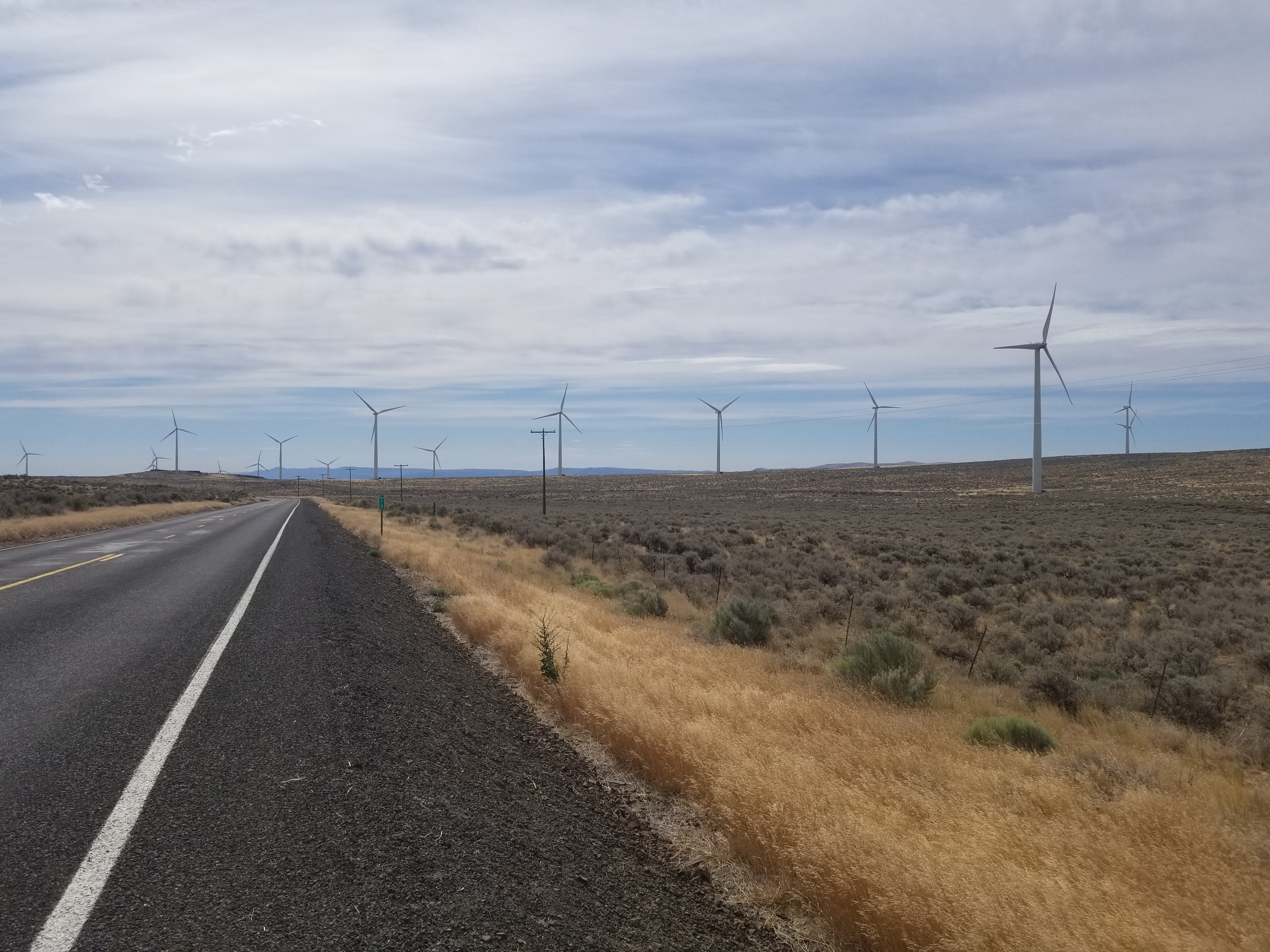 Today, up at 4 again, I walked three miles north from East Kittitas to connect with the Old Vantage Highway, then walked 11 miles on the Highway in buffeting winds. For the first 6 miles, the road is a constant gradual climb to a broad hilltop, home to several windfarms just a hadful of miles from the Columbia River Basin, so it should come as no surprise the the winds are fierce, however the lived experience is still startlingly abrasive. Sudden strong gusts made me sway in my path, my feet settling unexpectedly in deep gravel far from where I intended. My sunhat wouldn’t stay on and tied instead to my backpack acted as a sail, catching the wind, lifting my backpack up off my back, and dragging me inch by inch toward the roadside ditch. At the crest of the hill, I was forced to lean sideways into the wind and counterbrace myself with my walking pole. When the wind suddenly slacked, I’d pitch sideways for a brief, sickening moment before the wind returned. The sentinel windmills watched my halting passage impassively. It was exhausting, but I was frequently rewarded for my efforts with raptor sightings: gyrfalcons, peregrine falcons, red tailed hawks, sharpshinned hawks, and countless dark outlines in the sky. The strong winds and open country along the Old Vantage Highway make for some of the best birdwatching in the state.