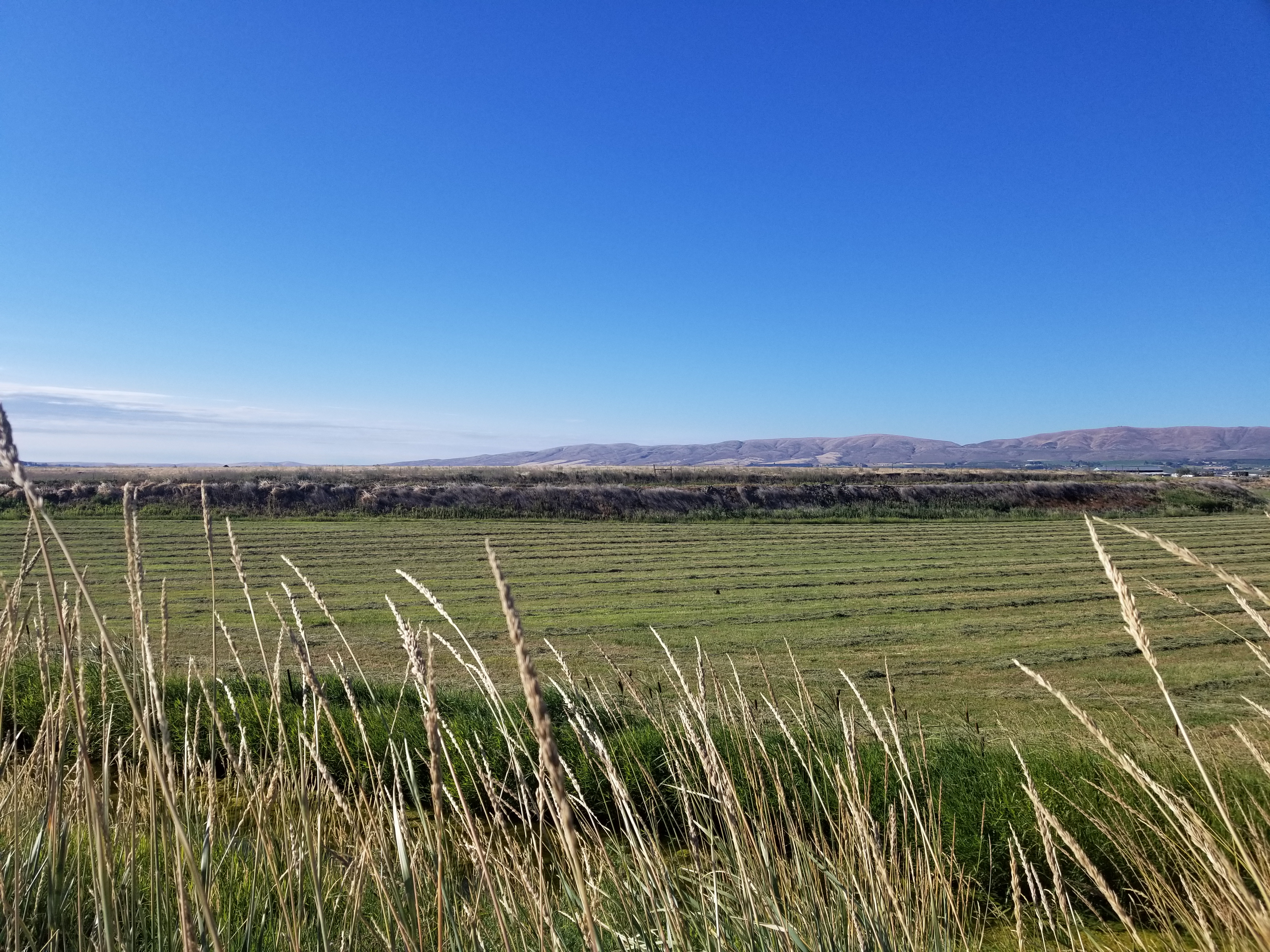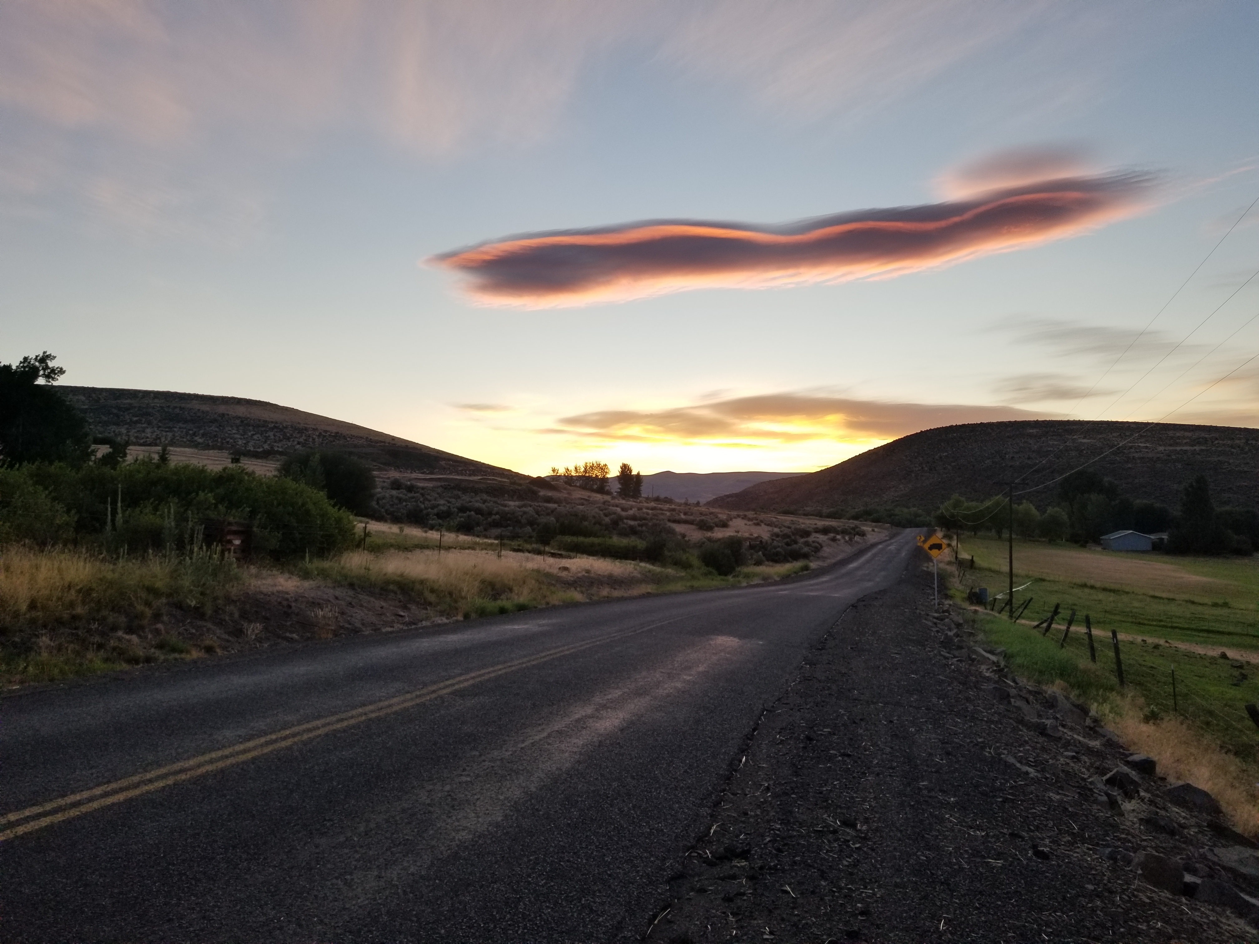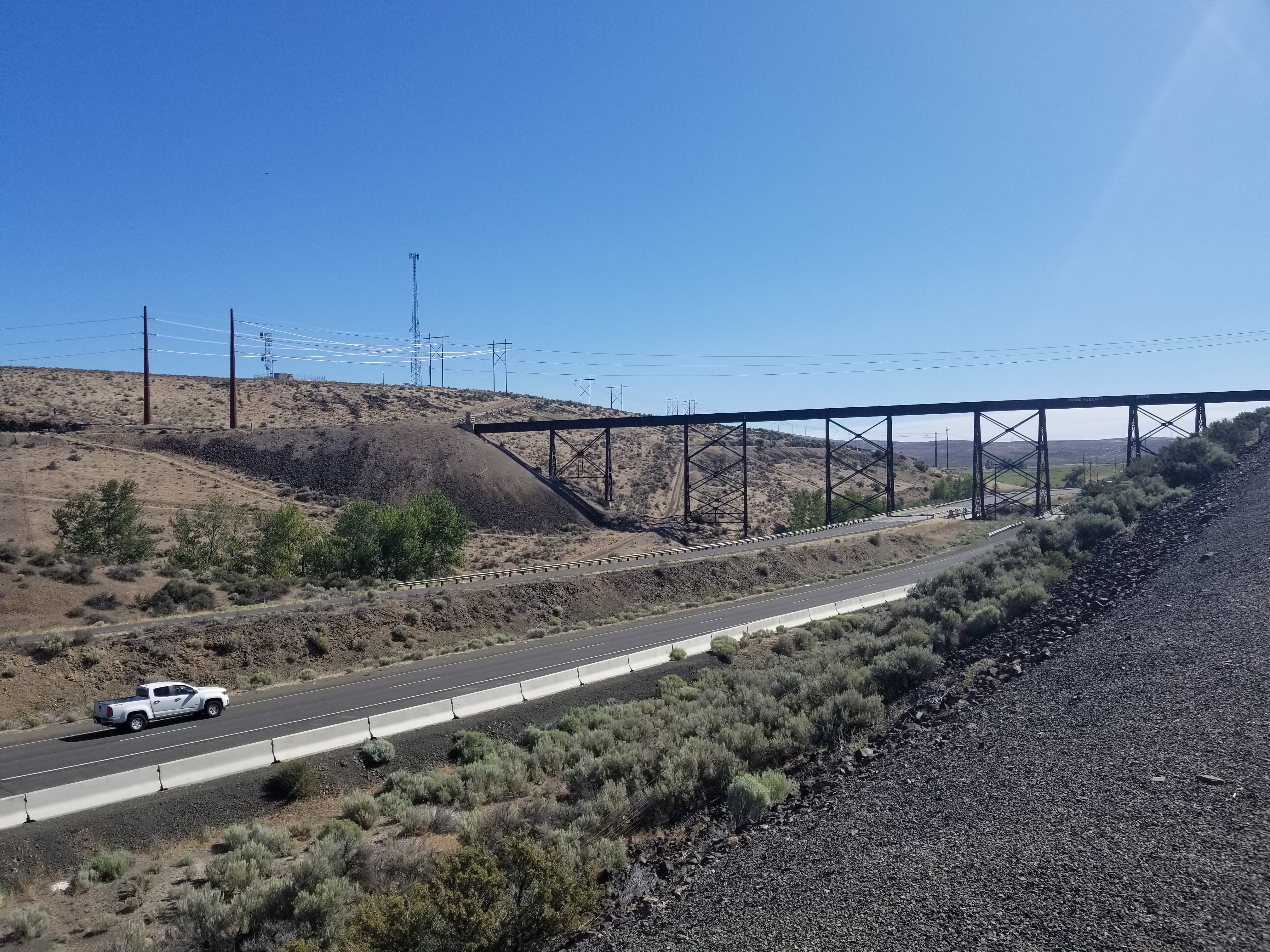 Today, up at 4 again, I walked three miles north from East Kittitas to connect with the Old Vantage Highway, then walked 11 miles on the Highway in buffeting winds. For the first 6 miles, the road is a constant gradual climb to a broad hilltop, home to several windfarms just a hadful of miles from the Columbia River Basin, so it should come as no surprise the the winds are fierce, however the lived experience is still startlingly abrasive. Sudden strong gusts made me sway in my path, my feet settling unexpectedly in deep gravel far from where I intended. My sunhat wouldn’t stay on and tied instead to my backpack acted as a sail, catching the wind, lifting my backpack up off my back, and dragging me inch by inch toward the roadside ditch. At the crest of the hill, I was forced to lean sideways into the wind and counterbrace myself with my walking pole. When the wind suddenly slacked, I’d pitch sideways for a brief, sickening moment before the wind returned. The sentinel windmills watched my halting passage impassively. It was exhausting, but I was frequently rewarded for my efforts with raptor sightings: gyrfalcons, peregrine falcons, red tailed hawks, sharpshinned hawks, and countless dark outlines in the sky. The strong winds and open country along the Old Vantage Highway make for some of the best birdwatching in the state.